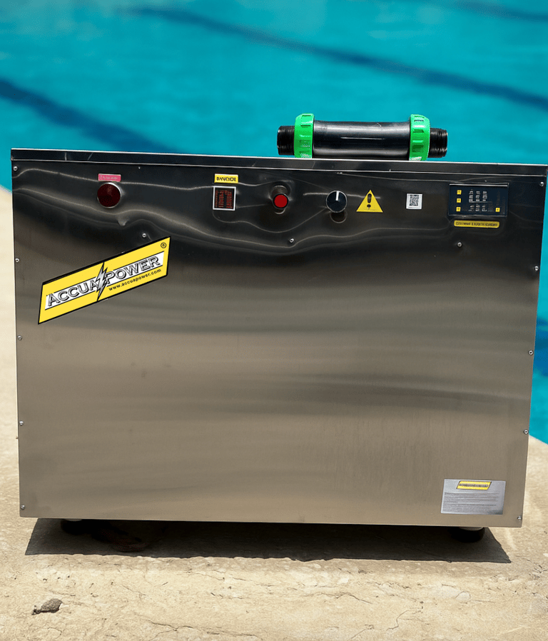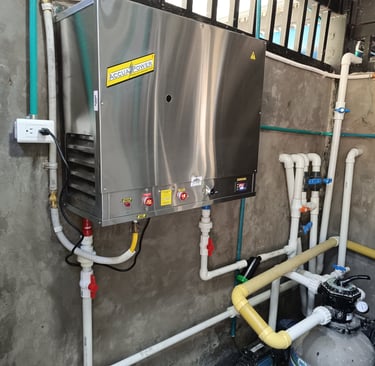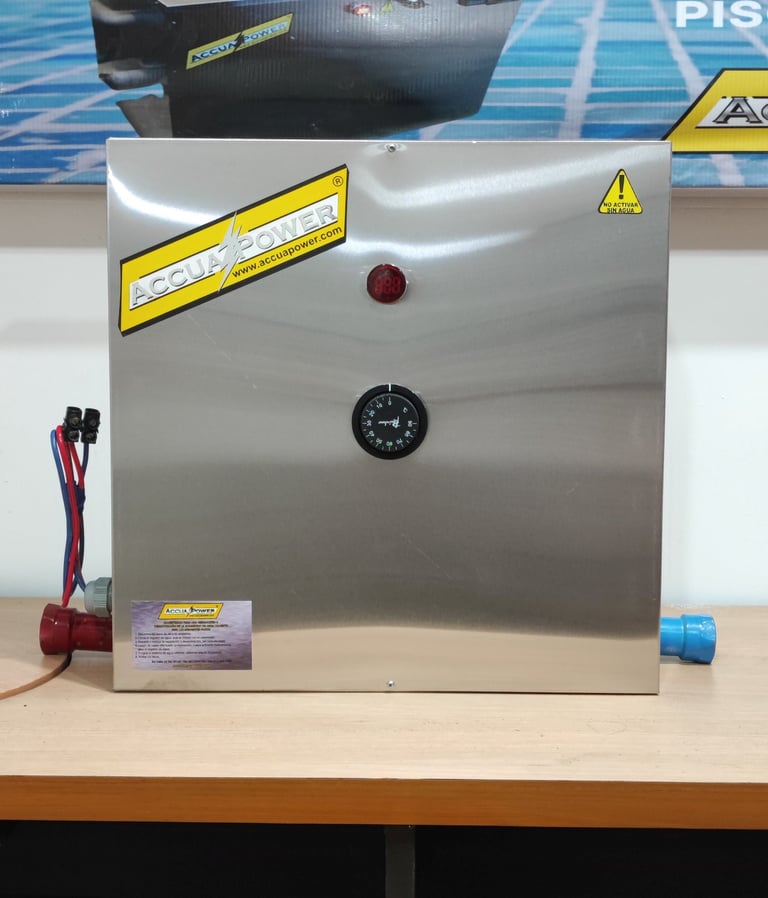 Climatizador de Piscina marca AccuaPower, con componentes certificados para todo tipo de requerimiento. Sí deseas climatizar tu Piscina hasta 32° o menos en poco tiempo somos tu mejor opcion